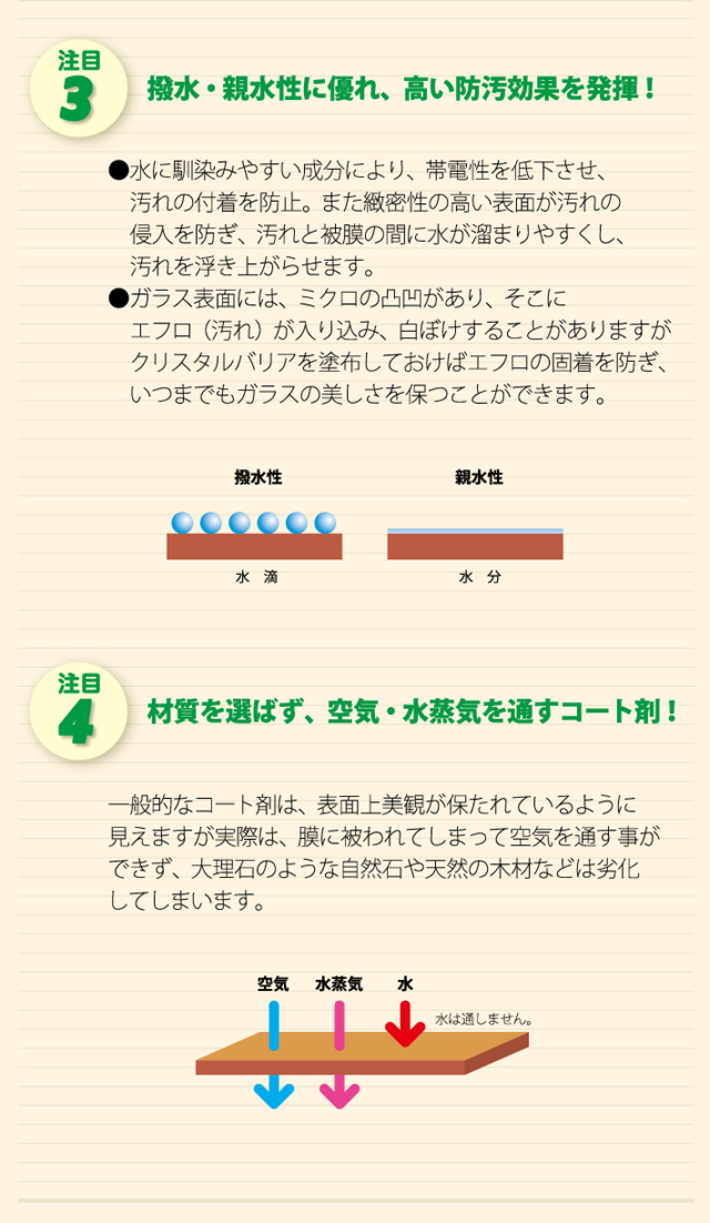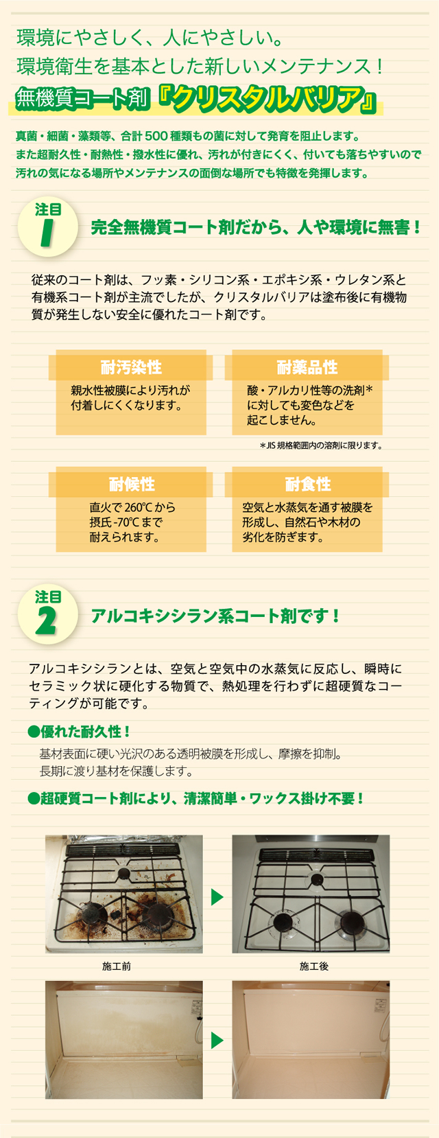 キレイにお掃除させて頂きましても、半年も経過すると、残念ですが汚れが目立ってきます。そこで今お勧めしたいのが、キレイになった水廻り(お風呂・キッチン・トイレ等)をそのままの状態に保ち、長期間の保護を可能にしたのが、無機質コーティング剤「クリスタルバリア」です。コーティングすることにより汚れが付きにくくなり、汚れが付いたとしても取れやすく、お掃除の手間も軽減されます。